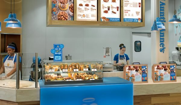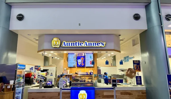 Cinnabon serves its iconic Classic Roll, MiniBon, and BonBites, plus chilled drinks like the MochaLatta Chill. Auntie Anne’s offers hot hand-rolled pretzels, nuggets, and mini pretzel dogs in flavors like Original, Cinnamon Sugar, and Pepperoni, with dips and lemonades.