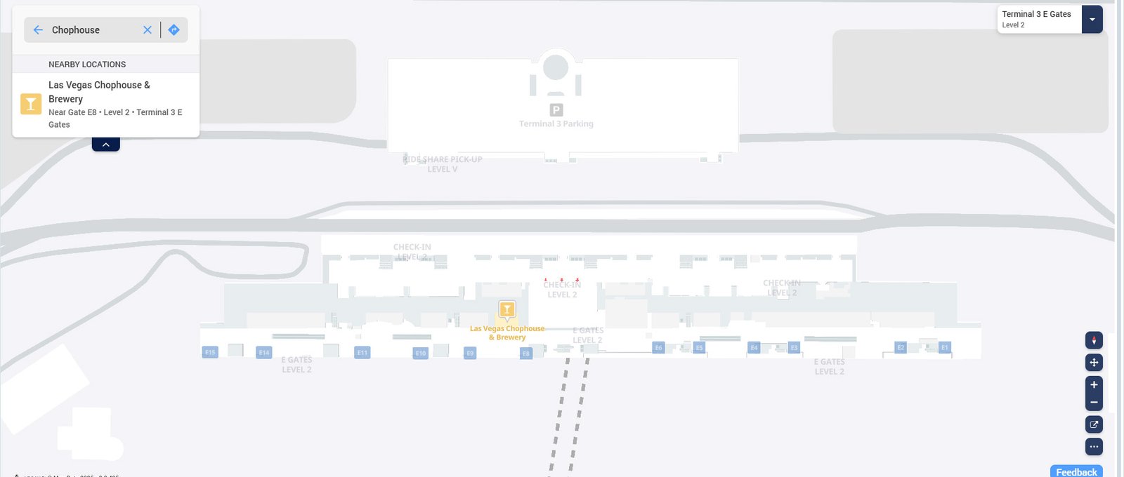 If you’re flying through Terminal 3 at Harry Reid International Airport, the Las Vegas Chophouse & Brewery is a great stop for a full meal before or after your flight. It’s located near Gate E10, close to landmarks like Starbucks (Gate E4) and Village Pub (Gate E14).